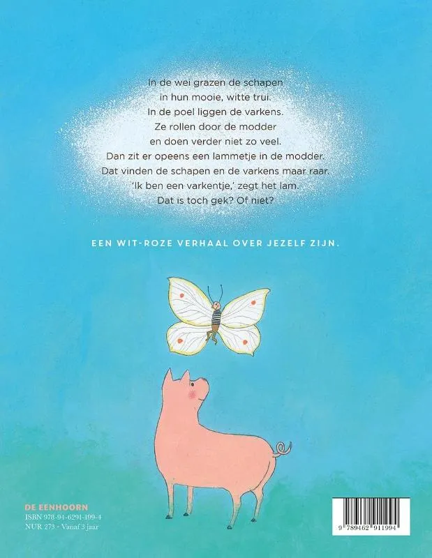 In de wei grazen de schapen in hun mooie, witte trui. In de poel liggen de varkens. Ze rollen door de modder. Dan zit er opeens een lammetje in de modder. Dat vinden de schapen en de varkens maar raar. ‘Ik ben een varkentje,’ zegt het lam. Dat is toch gek? Of niet?