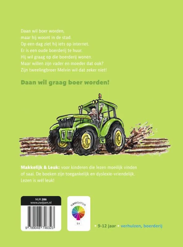 Wat als je broer goed is in álles? Sporten, muziek, school … Melvin kan alles. Maar Daan heeft een droom: hij wil boer worden. Hij zet alles op alles om zijn droom uit te laten komen, maar gaat het hem lukken? Dit aansprekende boek op AVI E4 is voor kinderen van 9-12 jaar in de serie ‘Makkelijk & Leuk’, speciaal voor kinderen die lezen moeilijk vinden of saai. Zo krijgen zij weer plezier in lezen. Dyslexievriendelijk!<br><br>De broer van Daan heet Melvin.<br>Melvin is goed in alles.<br>Goed op school, goed in muziek …<br>Maar Daan heeft een heel grote droom.<br>Hij droom van een eigen boerderij.<br>Hij wil kippen en een landje met aardappels.<br>Gaat dat lukken?