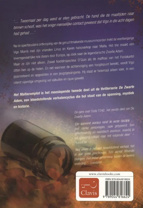 Na de spectaculaire ontknoping van de museummoorden in Code F242 trekt Vigo met zijn vrienden halsoverkop naar Malta om er de legendarische Zwarte Adem te zoeken. Na een hachelijke reis vol gevaren die hen dwars door Europa voert, bereiken ze met veel moeite de eilandengroep. Ze zijn echter niet alleen. Zowel hoofdinspecteur O’Quin als de maffiosi van het Paolakartel zitten hun op de hielen. En net als het trio op het punt staat een opzienbarende ontdekking te doen, wordt Vigo gearresteerd en opgesloten in een jeugdgevangenis. Eenzaam en alleen moet hij nu proberen te overleven in een uiterst vijandige omgeving vol valkuilen en rauw geweld.