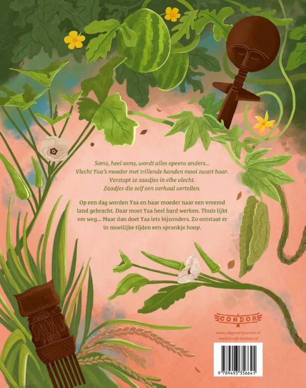 Maar… in Yaa’s vlechten heeft mama iets verstopt: zaadjes van de groente en het fruit uit hun thuisland. In het holst van de nacht gaat Yaa haar bed uit om de zaadjes te planten. Zo komt in de grote duisternis een sprankje hoop tot bloei.