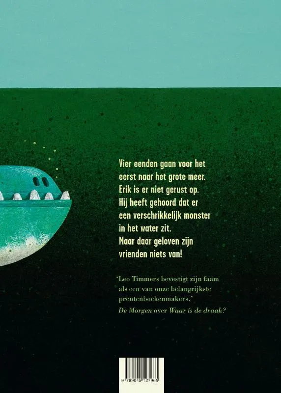 Vier eenden zijn hun kleine vijver beu. Het is tijd voor avontuur! Ze trekken naar het meer. Maar Erik is er niet gerust op. Er zou een monster in het water zitten. Maar volgens de anderen hoeft hij zich echt geen zorgen te maken. Dat van dat monster is maar een verhaaltje!<br><br>Een nieuw prentenboek van Leo Timmers, over vier vrienden die een grote stap zetten. En over Erik, die het avontuur van zijn leven meemaakt. Deze dag zal hij nooit vergeten.<br><br>Een nieuwe grootse Leo Timmers met grote uitklapper vol details.<br><br>Over De lieve krokodil<br><br>‘Een grappig verhaal van de altijd geweldige Leo Timmers’ Libelle<br><br>Telkens weer weet Leo Timmers de jonge lezers en kijkers met veel animo op sleeptouw te nemen’.’ De Morgen