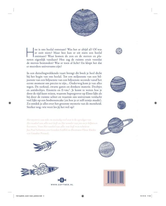 Met ‘Het mysterie van niks en oneindig veel snot’, een kinderboek over het ontstaan van het heelal, maken Jan Paul Schutten en Floor Rieder hun gelauwerde non-fictietrilogie compleet. Duik mee in de wereld van natuurkunde en sterrenkunde. Een wereld van tijdreizen, van zwarte gaten, van donkere materie, van deeltjes die dwars door jou en de hele aarde heen schieten en van oneindig veel andere heelallen met oneindig veel andere jou’s en mij’s – echt waar! Een wereld van het kleinste van het kleinste tot het grootste van het grootste. En een wereld van briljante denkers en wetenschappers die over zo ongeveer alle vragen in het universum hebben nagedacht.