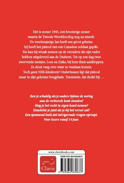 Het is zomer 1945, een broeierige zomer waarin de Tweede Wereldoorlog nog na smeult. De veertienjarige Jan heeft een groot geheim: hij heeft het pistool van een Canadese soldaat gepikt. Nu kan hij wraak nemen op de verraders die zijn vader hebben uitgeleverd aan de Duitsers. Tot op een dag twee zwervende meisjes, Loes en Ziska, bij hem thuis aankloppen. Ze doen vaag over waar ze vandaan komen. Toch geen NSB-kinderen? Ondertussen ligt dat pistool maar in zijn geheime bergplaats. Tenminste, dat denkt hij …