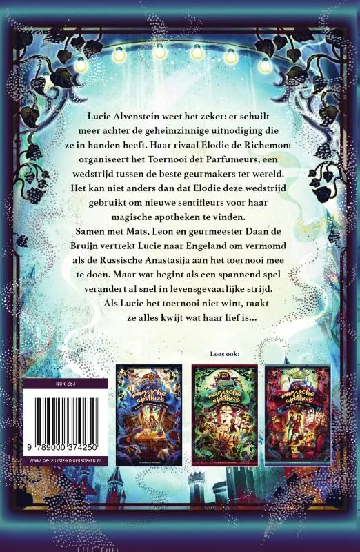 De magische apotheek-serie bestaat uit:Er hangt een geheim in de luchtHet mysterie van de zwarte bloemDe strijd om de meteoorHet toernooi van de parfumeursDe stad van de verloren tijdDe erfenis van Villa Evie***Meer lezen over de sentifleurs? Lees dan ook De magische academie:De ontdekking van de talentenGevaarlijk gefluister***Het geheime geurenboek