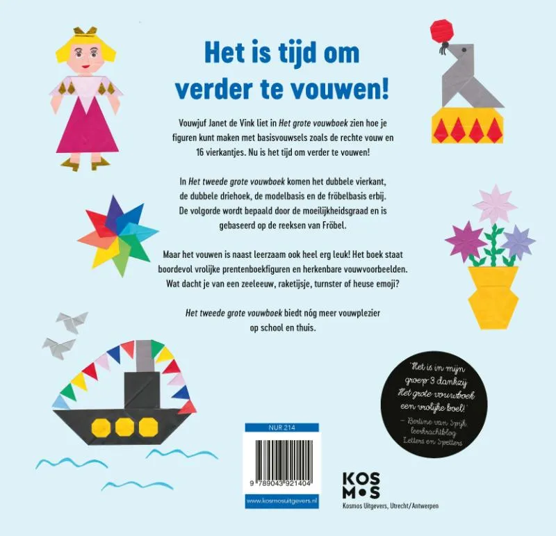 Janet Vink vouwt verder in Het tweede grote vouwboek! Vouwen met kinderen is leerzaam en leuk! Net als in Het grote vouwboek staan er in dit knutselboek weer tientallen vouwvoorbeelden waaraan kinderen met veel plezier zullen vouwen. De vouwjuf gaat daarbij uit van de basisvouwsels van de doorgaande lijn van Fröbel. De omschrijvingen zijn duidelijk, praktisch en eenvoudig te volgen. Het enige wat je nodig hebt, zijn vouwblaadjes! Het boek staat vol leuke vouwprojecten bij de feesten van het jaar, beroepen, sprookjes en natuurlijk veel herkenbare kinderboekfiguren. Vouwen was nog nooit zo leuk!