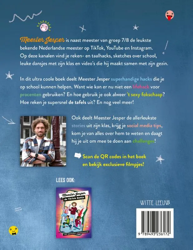 TikTok-held Meester Jesper heeft nu ook zijn eigen boek, boordevol hacks, stories, tips, tricks en challenges. Scan de QR-codes voor exclusieve filmpjes!
