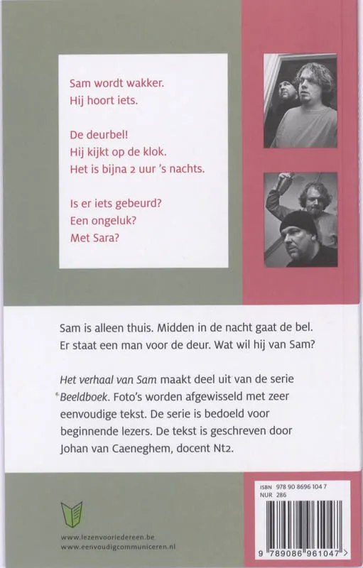 Sam is alleen thuis; hij kijkt naar het nieuws op televisie. Er is een gevaarlijke boef ontsnapt. Midden in de nacht wordt er aan de deur gebeld! Verhaal in korte zinnen en gemakkelijke woorden, bedoeld voor volwassenen met leesproblemen. Met veel zwart-witfoto’s.