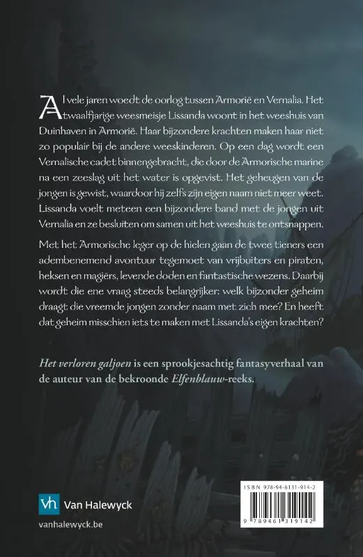 Lissanda voelt meteen een bijzondere band met de jongen uit Vernalia en ze besluiten om samen uit het weeshuis te ontsnappen. Met het Armorische leger op de hielen gaan de twee tieners een adembenemend avontuur tegemoet van vrijbuiters en piraten, heksen en magiërs, levende doden en fantastische wezens. Daarbij wordt die ene vraag steeds belangrijker: welk bijzonder geheim draagt die vreemde jongen zonder naam met zich mee? En heeft dat geheim misschien iets te maken met Lissanda’s eigen krachten? Het verloren galjoen is een sprookjesachtig fantasyverhaal van de auteur van de bekroonde Elfenblauw-reeks.