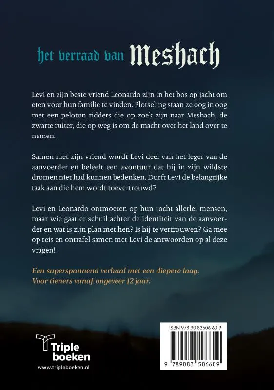 Levi en zijn beste vriend Leonardo zijn in het bos op jacht om eten voor hun familie te vinden. Plotseling staan ze oog in oog met een peloton ridders die op zoek zijn naar Meshach, de zwarte ruiter, die op weg is om de macht over het land over te nemen.Samen met zijn vriend wordt Levi deel van het leger van de aanvoerder en beleeft een avontuur waarvan hij in zijn wildste fantasieën niet had durven dromen. Durft Levi de belangrijke taak aan die hem wordt toevertrouwd? Leonardo en Levi ontmoeten op hun tocht allerlei mensen, maar wie gaat er schuil achter de identiteit van de aanvoerder en wat is zijn plan met hen? Is hij te vertrouwen? Ga mee op avontuur met Levi en Leonardo en leer belangrijke levenslessen om sterk te staan in de strijd om je hart!Een superspannend verhaal met een diepere laag. Voor tieners vanaf 12 jaar.