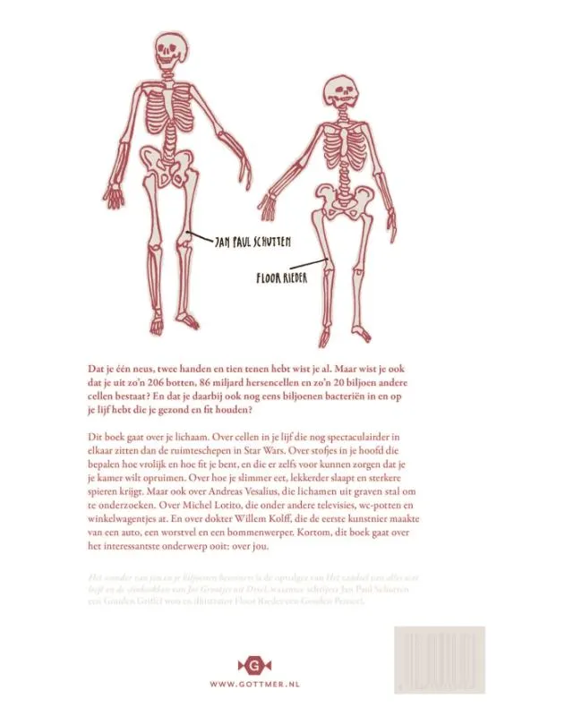 ‘Het wonder van jou en je biljoenen bewoners’ is een schitterend geïllustreerd non-fictieboek over het menselijk lichaam, voor kinderen vanaf 9 jaar. Als er iemand een wonder is, dan ben jij het wel. Ja, jij! Neem alleen al je bloedvaten. Als je die allemaal aan elkaar vast zou plakken, dan kreeg je een draad die twee keer om de aarde past. Of denk eens aan die biljoenenmicroben die in en op je lichaam zitten en die je heel hard nodig hebt om te overleven. Hoe zien ze eruit en wat doen ze daar?<br><br>’Het wonder van jou en je biljoenen bewoners’ is meer dan een boek over het menselijk lichaam. Het vertelt hoe een cel er vanbinnen uitziet. En dat een gewone cel in jouw lichaam er nog spectaculairder uitziet dan de Death Star uit ‘Star Wars’. Het legt uit hoe je kunt zien of iemand verliefd op je is, waarom je sneller boos wordt bij warm weer en waarom je slim wordt van kauwgom eten. Dat dus – en nog veel, veel, véél meer…<br><br>’Het wonder van jou en je biljoenen bewoners’ is het tweede deel van de grensverleggende non-fictietrilogie van Jan Paul Schutten en Floor Rieder. Het eerste deel, ‘Het raadsel van alles wat leeft’, over de evolutie, werd bekroond met de Gouden Griffel én het Gouden Penseel, en het derde deel in de reeks, ‘Het mysterie van niks en oneindig veel snot’, gaat over het ontstaan van het heelal. Alle drie de boeken zijn luxe uitgevoerd met goud-op-snee-bladzijden en een linnen rug.