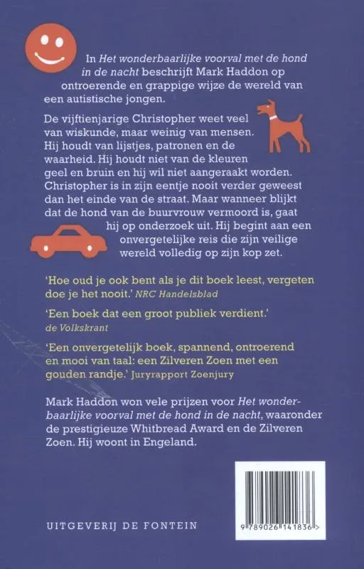Het wonderbaarlijke voorval met de hond in de nacht van Mark Haddon is een prachtige en ontroerende roman voor jongeren en volwassenen. Het won vele prijzen in binnen- en buitenland. ‘Hoe oud je ook bent als je dit boek leest, vergeten doe je het nooit.’ – NRC Handelsblad<br><br>De vijftienjarige Christopher weet veel van wiskunde, maar weinig van mensen. Hij houdt van lijstjes, patronen en de waarheid. Hij houdt niet van de kleuren geel en bruin en hij wil niet aangeraakt worden. Christopher is in zijn eentje nooit verder geweest dan het einde van de straat. Maar wanneer blijkt dat de hond van de buurvrouw vermoord is, gaat hij op onderzoek uit. Hij begint aan een onvergetelijke reis die zijn veilige wereld volledig op zijn kop zet.<br><br>Het wonderbaarlijke voorval met de hond in de nacht werd internationaal meervoudig bekroond, onder andere met de prestigieuze Whitbread Award en de Zilveren Zoen. <br><br>De pers over Het wonderbaarlijke voorval met de hond in de nacht: <br>’Een meeslepend, glashelder geschreven verhaal. Een boek dat een groot publiek verdient.’ – de Volkskrant<br>’Een onvergetelijk boek, spannend, ontroerend en mooi van taal: een Zilveren Zoen met een gouden randje.’ – Juryrapport Zoenjury