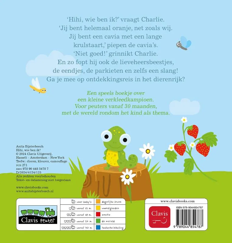 ‘Hihi, wie ben ik?’ vraagt Charlie. ‘Jij bent helemaal oranje, net zoals wij. Jij bent een cavia met een lange krulstaart,’ piepen de cavia’s. ‘Niet goed!’ grinnikt Charlie. En zo fopt hij ook de lieveheersbeestjes, de eendjes, de parkieten en zelfs een slang! Ga je mee op ontdekkingsreis in het dierenrijk? Een speels boekje over een kleine verkleedkampioen. Voor peuters vanaf 30 maanden, met de wereld rondom het kind als thema.