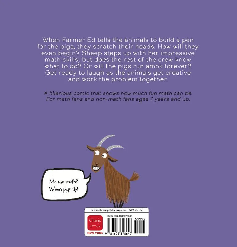 When Farmer Ed tells the animals to build a pen for the pigs, they scratch their heads. How will they even begin? Sheep steps up with his impressive math skills, but does the rest of the crew know what to do? Or will the pigs run amok forever? Get ready to laugh as the animals get creative and work the problem together. A hilarious comic that shows how much fun math can be. For math fans and non-math fans, ages 7 years and up.