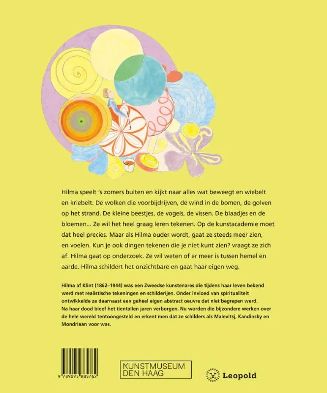 Hilma kan de natuur mooi tekenen zoals ze die ziet, maar schildert het liefst dingen die ze niet ziet. Prentvertelling met kleurenillustraties geïnspireerd op de abstracte kunst van de Zweedse schilder Hilma af Klint (1862-1944). Vanaf ca. 5 jaar.