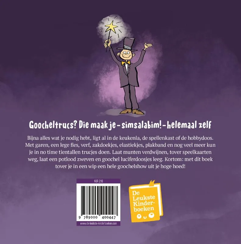 Goocheltrucs? Die maak je – simsalabim! – helemaal zelf met dit geweldig leuke boek. Bijna alle spullen die je nodig hebt, liggen al in de keukenla, handwerkkist of hobbydoos. Maak in een wip tientallen trucjes en betover daarna je publiek. Laat munten verdwijnen, tover speelkaarten weg, laat een potlood zweven en goochel luciferdoosjes leeg. Kortom: met dit boek tover je in een handomdraai een hele voorstelling uit je hoge hoed!