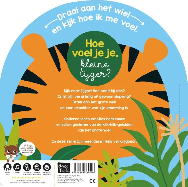 Draai aan het wiel en kijk hoe ik me voel! Kijk naar Tijger! Hoe voelt hij zich? Is hij blij, verdrietig, bang of misschien slaperig? Als je aan het wiel draait, veranderen de ogen van kleine tijger. In welke stemming is hij nu? Extra leuk is het klik-klik-geluid dat je hoort als je aan het wiel draait.