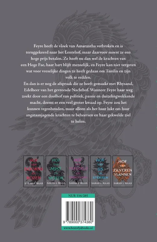 Feyre heeft de vloek van Amarantha verbroken en is teruggekeerd naar het Lentehof, maar daarvoor moest ze een hoge prijs betalen. De vreselijke dingen die ze heeft gedaan om Tamlin te redden kan niet ze vergeten en ook haar afspraak met Rhysand, Edelheer van het gevreesde Nachthof, heeft ze maar al te goed onthouden. Terwijl Feyre haar weg zoekt door een doolhof van politiek, passie en duizelingwekkende macht, doemt er een veel groter kwaad op. Feyre zou het kunnen tegenhouden, maar alleen als het haar lukt om haar angstaanjagende krachten te beheersen en haar gekwelde ziel te helen.