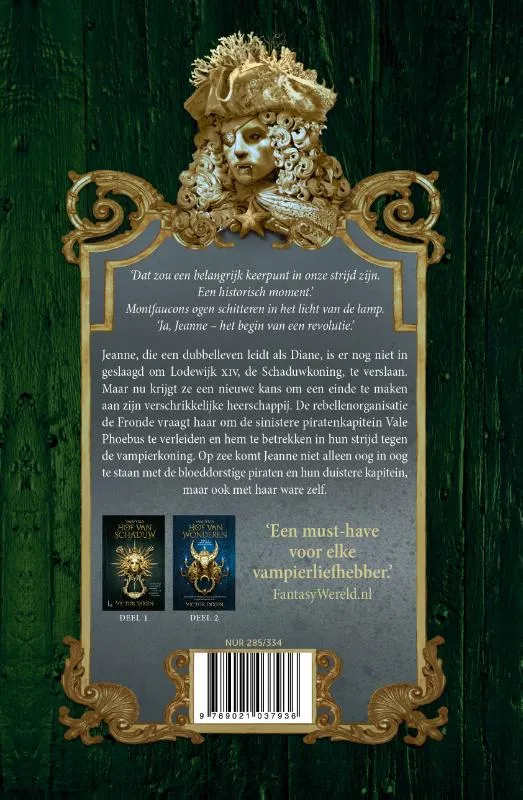 Na Hof van Schaduw en Hof van Wonderen van Victor Dixen maakt Jeanne zich klaar voor de eindstrijd tegen de vampierkoning in dit buitengewoon spannende laatste deel van de Vampyria-saga. Eenmalige luxe editie met bedrukt boekblok.<br> <br> Jeanne, die een dubbelleven leidt als Diane, is er nog niet in geslaagd om Lodewijk XIV, de Schaduwkoning, te verslaan. Maar nu krijgt ze een nieuwe kans om een einde te maken aan de verschrikkelijke heerschappij van de vampierkoning. De Fronde, de rebellenorganisatie die in het geheim strijdt tegen de vampieren, doet Jeanne een schokkend verzoek: ze moet de sinistere piratenkapitein Vale Phoebus verleiden om hem te betrekken in hun strijd tegen de Schaduwkoning. Op weg naar Amerika, het land dat zich al eeuwenlang onttrekt aan de oude vampieraristocratie in Europa, komt Jeanne niet alleen oog in oog te staan met de bloeddorstige piraten en hun duistere kapitein, maar ook met haar ware zelf.<br> <br> 'Betoverende en intrigerende roman die zowel fans van het vampiergenre als liefhebbers van YA-fantasie zal bekoren. Victor Dixen heeft met dit boek een meesterwerk afgeleverd.'<br> Thrillzone.nl over Vampyria 1 – Hof van Schaduw<br> <br> <br> <br>