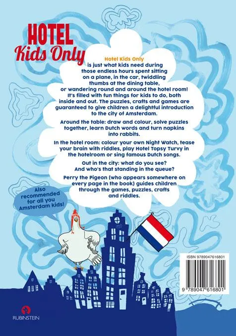 Hotel Kids Only is just what kids need during those endless hours spent sitting on a plane, in the car, twiddling thumbs at the dining table, or wandering round and around the hotel room! It’s filled with fun things for kids to do, both inside and out. The puzzles, crafts and games are guaranteed to give children a delightful introduction to the city of Amsterdam. Around the table: draw and colour, solve puzzles together, learn Dutch words and turn napkins into rabbits. In the hotel room: colour your own Night Watch, tease your brain with riddles, play Hotel Topsy Turvy in the hotelroom or sing famous Dutch songs. Out in the city: what do you see? And who’s that standing in the queue? Perry the Pigeon (who appears somewhere on every page in the book) guides children through the games, puzzles, crafts and riddles. Also recommended for all you Amsterdam kids!