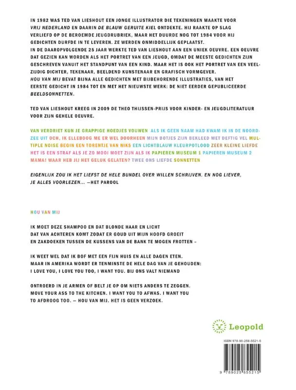 Hou van mij bevat bijna alle gedichten met bijbehorende illustraties, van het eerste gedicht in 1984 tot en met het nieuwste werk: de niet eerder gepubliceerde beeldsonnetten.