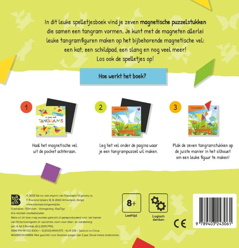 In dit leuke spelletjesboek vind je zeven magnetische puzzelstukken die samen een tangram vormen. Je kunt met de magneten allerlei leuke tangramfiguren maken op het bijbehorende magnetische vel: een kat, een schildpad, een slang en nog veel meer.Los ook de spelletjes op.Hoe werkt het boek?Haal het magnetische vel uit de pocket achteraan.Leg het vel onder de pagina waar je een tangrampuzzel wil maken.Plak de zeven tangramstukken op de juiste manier in het silhouet om een leuke figuur te maken.