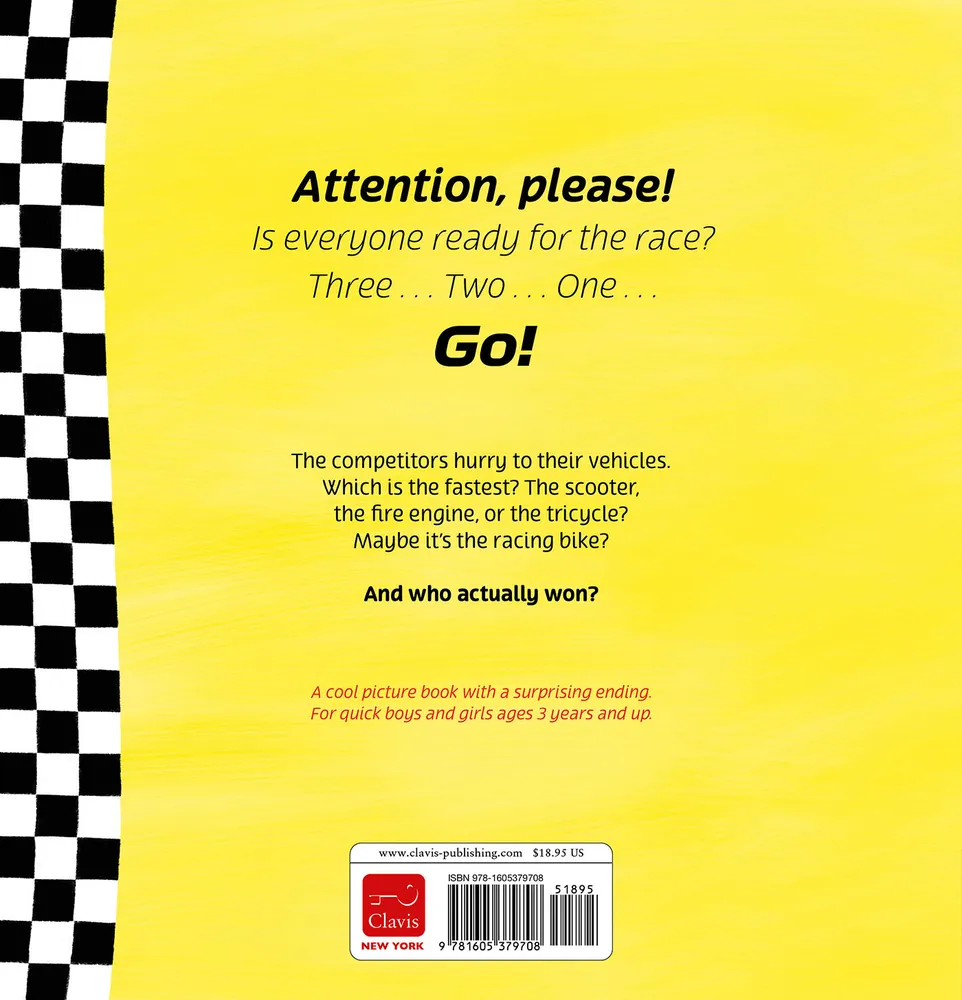Een groep dieren achtervolgt elkaar op allerlei voertuigen: een driewieler, scooter, jeep, quad en nog veel meer voertuigen. Maar wie heeft er nu eigenlijk gewonnen? Prentenboek met vrolijk gekleurde paginagrote tekeningen. Vanaf ca. 4 jaar