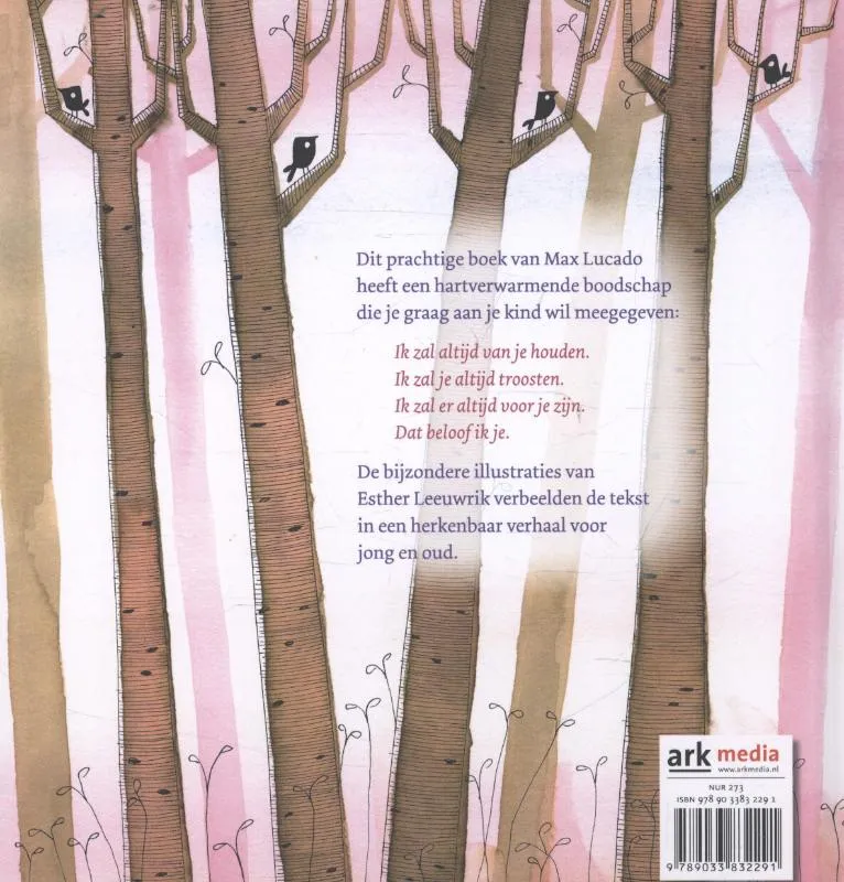 ‘Ik beloof het je’ is prachtig prentenboek van Max Lucado voor kinderen van ongeveer 4-8 jaar. Het is een hulpmiddel voor ouders om hun kind een blijvende boodschap mee te geven: wij houden van je en God is er altijd! Dit prentenboek vertelt het verhaal van een vader en een kind, waarin de vader uitlegt wat het kind betekent voor de ouders én voor God. Een erg bemoedigende boodschap die blijvend is. Daardoor zeer geschikt als cadeau bij geboorte/doop en opdragen. Mooi geïllustreerd door Esther Leeuwrik, die in 2012 haar debuut maakte met het zeer succesvolle actieprentenboek ‘Ik stuur je de zon’.