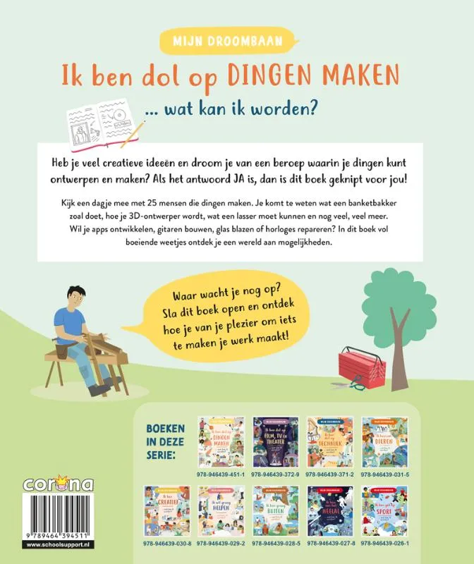 Kijk een dagje mee met 25 mensen die dingen maken. Je komt te weten wat een banketbakker zoal doet, hoe je 3D-ontwerper wordt, wat een lasser moet kunnen en nog veel, veel meer. Wil je apps ontwikkelen, gitaren bouwen, glas blazen of horloges repareren? In dit boek vol boeiende weetjes ontdek je een wereld aan mogelijkheden.