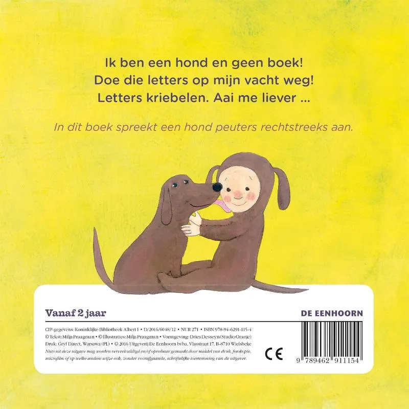 Grappig dierenboek. Met leuke verrassingen onder de apjes. Ik ben een hond en geen boek. Doe die letters op mijn vacht weg! Letters kriebelen. Aai me liever. Als het kriebelt, moet ik krabben. En ik heb geen tijd om te krabben, want ik moet jou bewaken. In dit boek spreekt een hond de lezers direct aan.