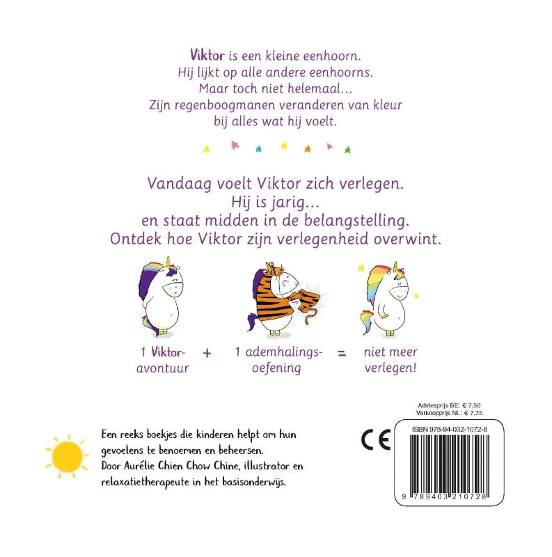 Vandaag voelt Viktor zich verlegen. Hij is jarig… en staat midden in de belangstelling. Ontdek hoe Viktor zijn verlegenheid overwint.Viktor is een kleine eenhoorn. Hij lijkt op alle andere eenhoorns. Maar toch niet helemaal… Zijn regenboogmanen veranderen van kleur bij alles wat hij voelt.Wat Viktor voelt… is een reeks interactieve verhalenboekjes die kinderen helpt om hun gevoelens te benoemen en beheersen.