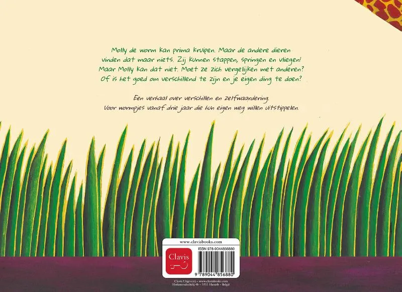 Molly de worm kan prima kruipen. Maar de andere dieren vinden dat maar niets. Zij kunnen stappen, springen en vliegen! Maar Molly kan dat niet. Moet ze zich vergelijken met anderen? Of is het goed om verschillend te zijn en je eigen ding te doen?Een verhaal over verschillen en zelfwaardering.Voor wormpjes vanaf drie jaar die hun eigen weg willen uitstippelen.