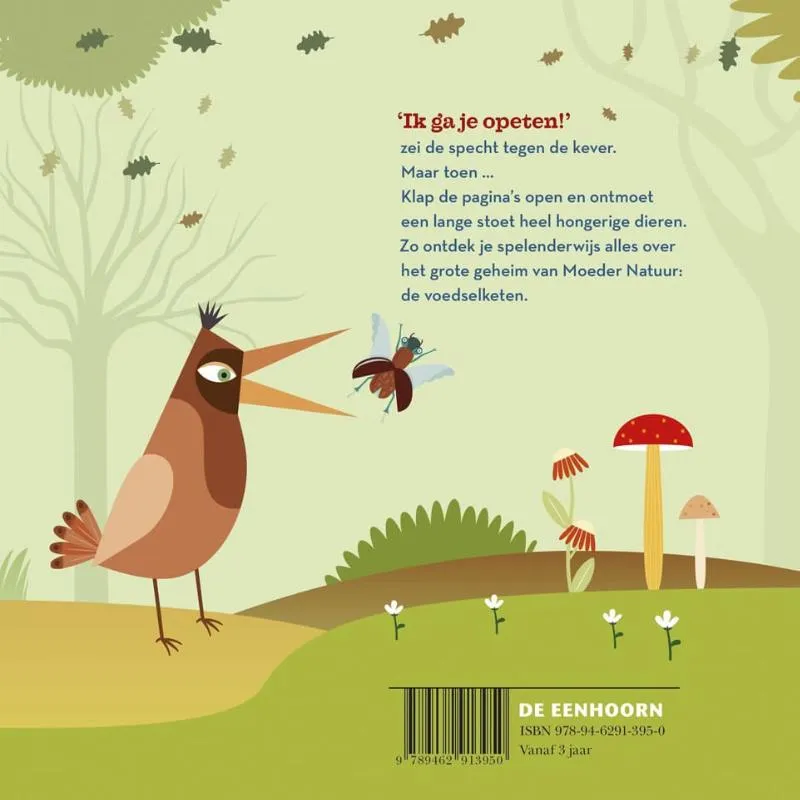 Klap de pagina’s open en ontmoet een lange stoet erg hongerige dieren. Zo ontdek je spelenderwijs alles over het grote geheim van Moeder Natuur: de voedselketen. Kijk ook goed naar de leefomgeving van deze dieren. Sommige dieren kunnen zich erg goed verstoppen voor hun vijanden. Kan je ze allemaal terugvinden?