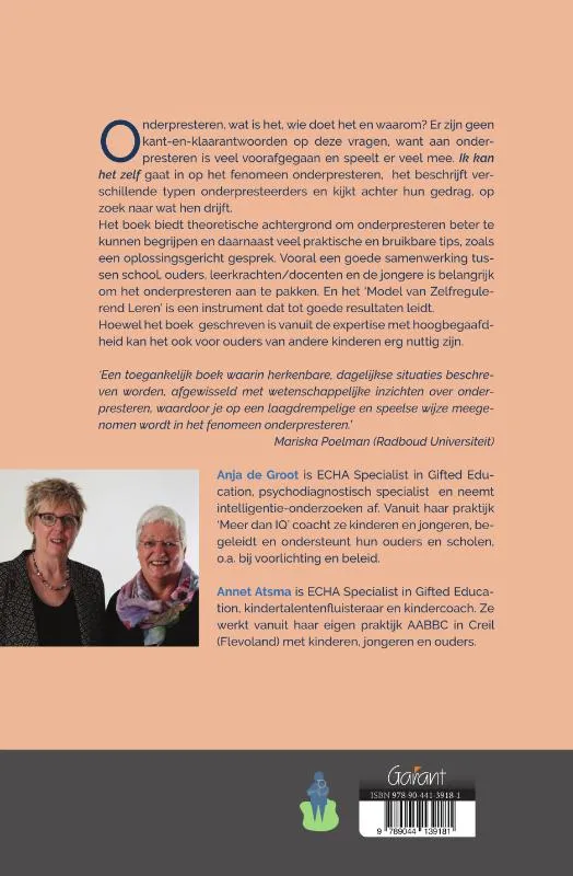 Anja de Groot is ECHA Specialist in Gifted Education, psychodiagnostisch specialist en neemt intelligentie-onderzoeken af. Vanuit haar praktijk ‘Meer dan IQ’ coacht ze kinderen en jongeren, begeleidt en ondersteunt hun ouders en scholen, o.a. bij voorlichting en beleid.<br><br> Annet Atsma is ECHA Specialist in Gifted Education, kindertalentenfluisteraar en kindercoach. Ze werkt vanuit haar eigen praktijk AABBC in Creil (Flevoland) met kinderen, jongeren en ouders.