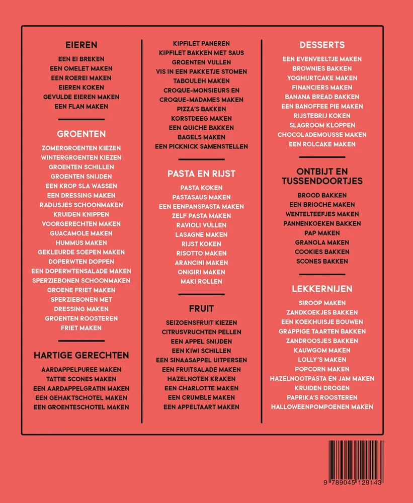 Het perfecte basiskookboek voor het hele gezin: eenvoudige en meer uitdagende recepten, belangrijke basistechnieken, handige tips, kennis over producten en de verkrijgbaarheid per seizoen. Natuurlijk met heel veel illustraties (zowel foto’s als tekeningen) waarin stap voor stap getoond wordt hoe je een gerecht bereidt. Van omelet tot zelfgemaakte pizza en van chocolademousse tot appeltaart. Maar ook zelf jam koken, bananenbrood bakken, kauwgum of limonade maken en nog heel veel meer.