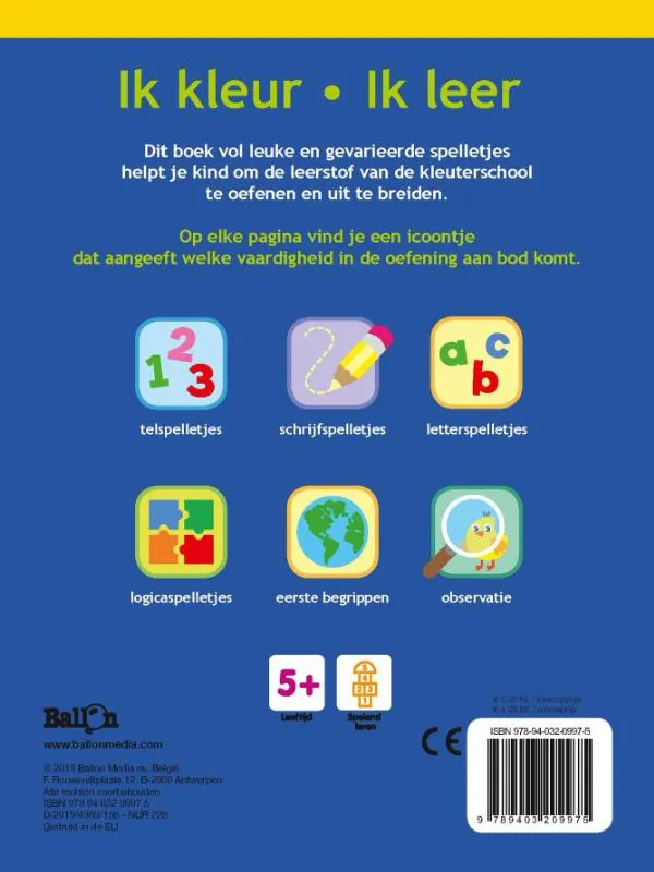 Logisch denken, begrippen, leren tellen, observeren, …Dit boek vol leuke en gevarieerde spelletjes helpt kleuters vanaf 5 jaar om de leerstof van de kleuterschool te oefenen en uit te breiden. Op elke pagina vind je een icoontje dat aangeeft welke vaardigheid in de oefening aan bod komt. Zo kan je kind spelenderwijs begrippen inoefenen en wordt de motoriek verfijnd.