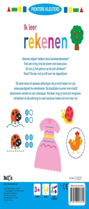 Dit boek staat vol speelse oefeningen die kinderen vanaf 3 jaar helpen om hun rekenvaardigheid te ontwikkelen. De bladzijden kunnen met viltstift beschreven worden en zijn uitwisbaar. Hierdoor mag je kind zich vergissen, verbeteren en de oefening zo vaak opnieuw maken als het maar wil.