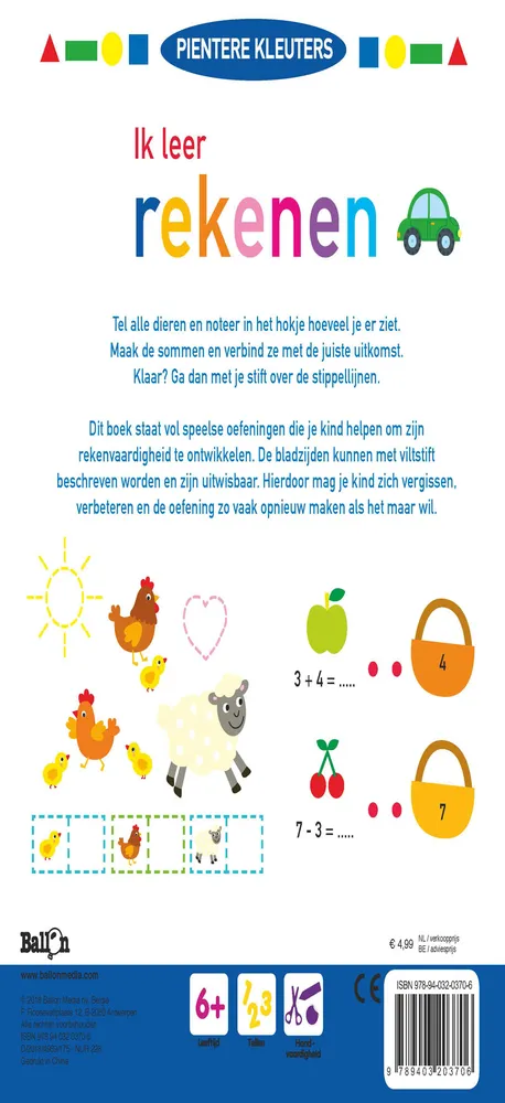 Dit boek staat vol speelse oefeningen die kinderen vanaf 6 jaar helpen om hun rekenvaardigheid te ontwikkelen. De bladzijden kunnen met viltstift beschreven worden en zijn uitwisbaar. Hierdoor mag je kind zich vergissen, verbeteren en de oefening zo vaak opnieuw maken als het maar wil.