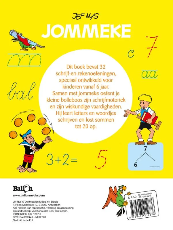 Dit boek bevat 32 schrijf-en rekenoefeningen, speciaal ontwikkeld voor kinderen vanaf 6 jaar. Samen met Jommeke oefent je kleine bolleboos zijn schrijfmotoriek en zijn wiskundige vaardigheden. Hij leert letters en woordjes schrijven en lost sommen tot 20 op. De herkenbare Jommeke-illustraties maken al dat tel-, reken- en schrijfwerk extra leuk!