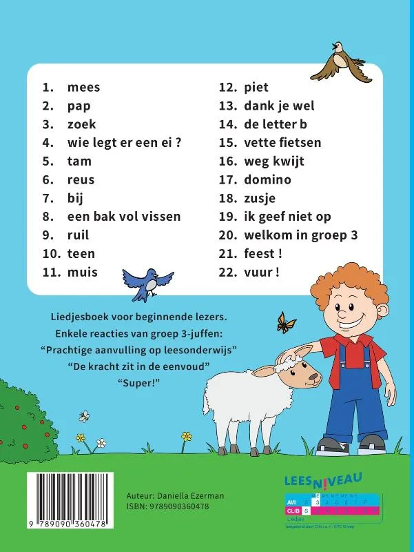 Zing je mee over de muis? Of over de reus? Bundel met 22 liedjes op AVI-niveau E3, met links naar YouTube. Met kleurrijke illustraties. Vanaf ca. 7 jaar.