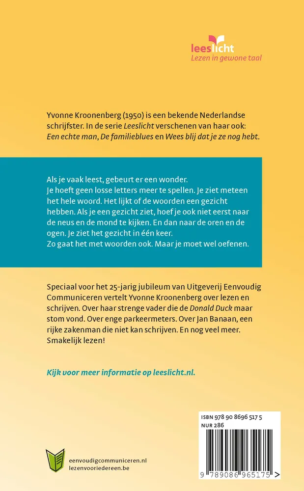 Iedereen kent haar, de schrijfster Yvonne Kroonenberg. Speciaal voor het 25-jarig jubileum van Uitgeverij Eenvoudig Communiceren schreef zij haar herinneringen aan lezen op. Over leesplankjes en zinnen als kronkelende rivieren. Over meisjesboeken en iPads. Dit alles gelardeerd met verhalen over laaggeletterdheid, over het nut van voorlezen en over haar liefde voor geschreven taal. Elk hoofdstukje is een afzonderlijk te lezen verhaal. Zo kun je tijdens de les iedere dag een stukje lezen met je groep. Zomaar, omdat lezen zo fijn is!