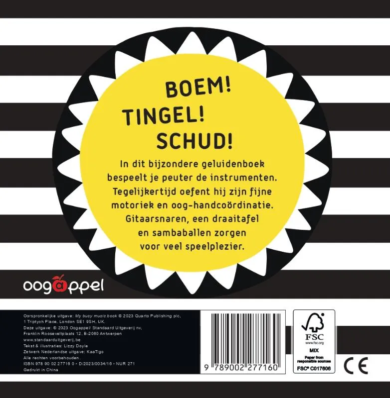 In dit bijzondere geluidenboek bespeelt je peuter de instrumenten. Tegelijkertijd oefent hij zijn fijne motoriek en oog-handcoördinatie. Gitaarsnaren, een draaitafel en sambaballen zorgen voor veel speelplezier.