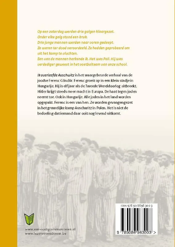 Waargebeurd verhaal van een overlevende van het concentratiekamp Auschwitz. Bijzonder om twee redenen. Dit verhaal vertelt de omzwervingen van een Hongaarse jongen, die doordat hij joods is, van het ene kamp in het andere belandt. Zijn survivaltocht nádat hij Auschwitz heeft overleefd, is ook zeer pakkend en realistisch beschreven. En het tweede bijzondere deel aan dit verhaal is het eenvoudige taalniveau. Zwakke lezers, jongeren met een taalachterstand en migranten zullen dit verhaal met veel aandacht en belangstelling lezen.