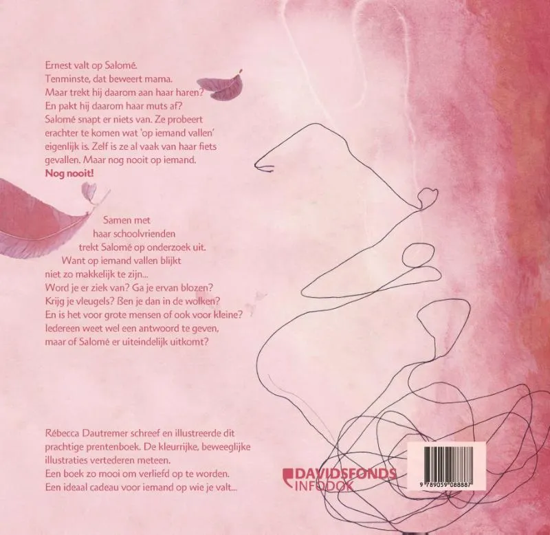 Ernest valt op Salomé. Tenminste, dat beweert mama. Maar trekt hij daarom aan haar haren? En pakt hij daarom haar muts af? Salomé snapt er niets van. Ze probeert erachter te komen wat ‘op iemand vallen’ eigenlijk is. Zelf is ze al vaak van haar fiets gevallen. Maar nog nooit op iemand. Nog nooit! Samen met haar schoolvrienden trekt Salomé op onderzoek uit. Want op iemand vallen blijkt niet zo makkelijk te zijn… Word je er ziek van? Ga je ervan blozen? Krijg je vleugels? Ben je dan in de wolken? En is het voor grote mensen of ook voor kleine? Iedereen weet wel een antwoord te geven, maar of Salomé er uiteindelijk uitkomt? Rébecca Dautremer schreef en illustreerde dit prachtige prentenboek. De kleurrijke, beweeglijke illustraties vertederen meteen. Een boek zo mooi om verliefd op te worden. Een ideaal cadeau voor iemand op wie je valt…