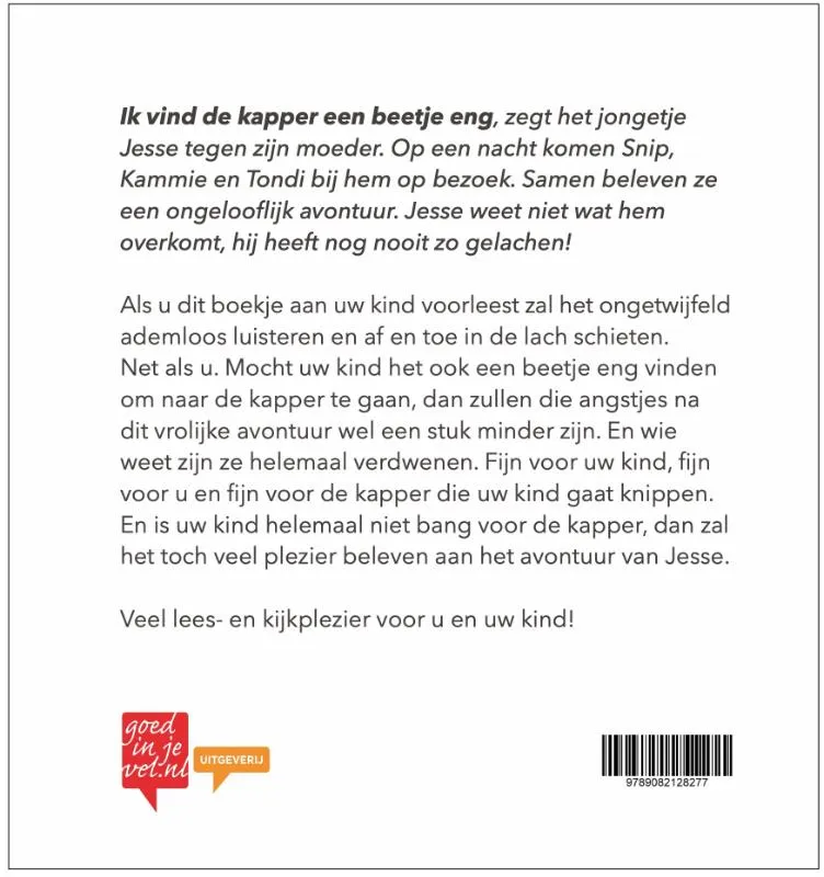 Als u dit boekje aan uw kind voorleest zal het ongetwijfeld ademloos luisteren en af en toe in de lach schieten. Net als u. Mocht uw kind het ook een beetje eng vinden om naar de kapper te gaan, dan zullen die angstjes na dit vrolijke avontuur wel een stuk minder zijn. En wie weet zijn ze helemaal verdwenen. Fijn voor uw kind, fijn voor u en fijn voor de kapper die uw kind gaat knippen. En is uw kind helemaal niet bang voor de kapper, dan zal het toch veel plezier beleven aan het avontuur van Jesse. Veel lees- en kijkplezier voor u en uw kind!