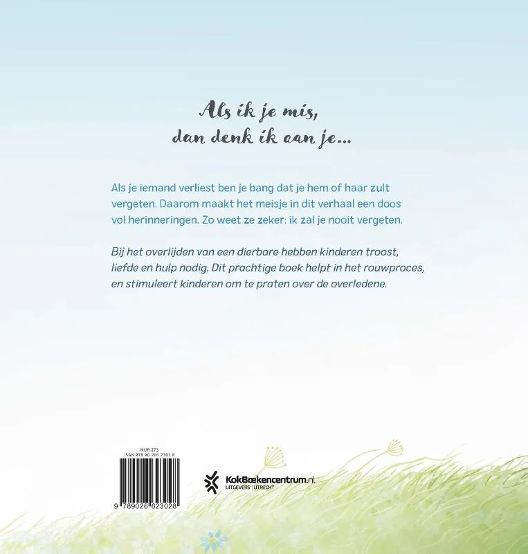 ‘Ik wil je nooit vergeten’ is een troostrijk prentenboek voor kinderen die een dierbare verloren hebben. Een jong meisje heeft iemand verloren van wie ze heel veel houdt. Ze maakt een doos waarin ze momenten en herinneringen verzamelt, en ze vertelt over hoe ze zicht voelt. Achterin het boek vind je meer informatie en tips om kinderen verder te helpen in hun rouwproces. Dit prentenboek maakt rouw bespreekbaar en helpt om het gesprek met kinderen aan te gaan. Door het unieke perspectief is het een universeel verhaal, dat gelezen kan worden bij het overlijden van een vriend, familielid of zelfs een huisdier.