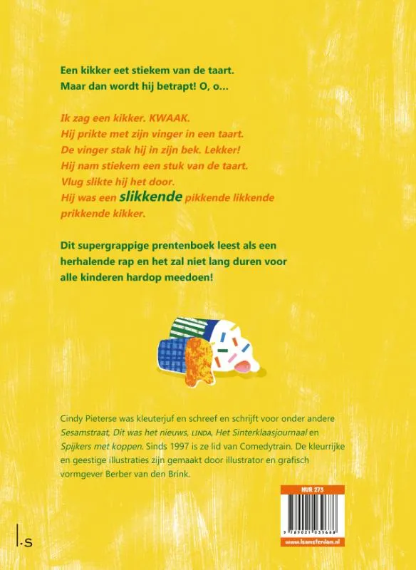 Cindy Pieterse schrijft voor satirische tv-programma’s, schreef voor Sesamstraat en was kleuterjuf. Net als de kikker in haar boek is ze gek op taart. De kleurrijke en grappige illustraties zijn gemaakt door illustrator en grafisch vormgever Berber van den Brink.