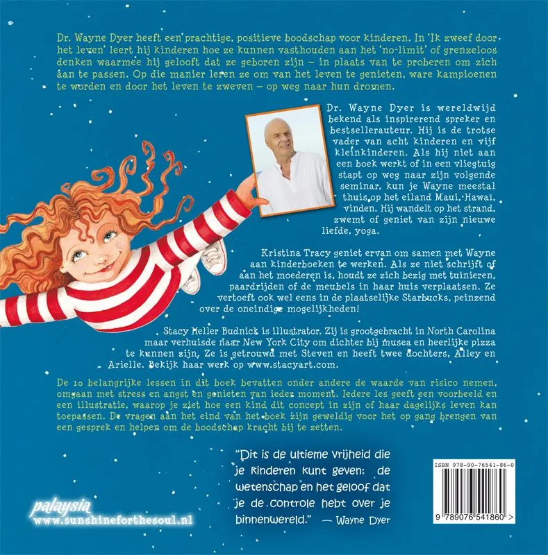 Dr. Wayne Dyer heeft een prachtige, positieve boodschap voor kinderen. In ‘Ik zweef door het leven’ leert hij kinderen hoe ze kunnen vasthouden aan het ‘no-limit’ of grenzeloos denken waarmee hij gelooft dat ze geboren zijn – in plaats van te proberen om zich aan te passen. Op die manier leren ze om van het leven te genieten, ware kampioenen te worden en door het leven te zweven – op weg naar hun dromen.