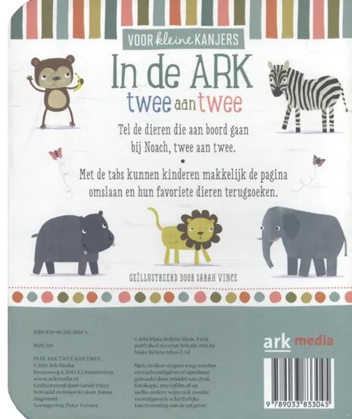 Kartonboekje met stevige tabs aan elke pagina. Vrolijke illustraties en rijmende tekst. Het bekende bijbelverhaal over de ark van Noach. Voor kinderen van 1 tot 3 jaar. Door de stevige uitvoering zeer geschikt voor de jongste kinderen om zelf in te bladeren. Een aantrekkelijk cadeau bij de doop van een kind.