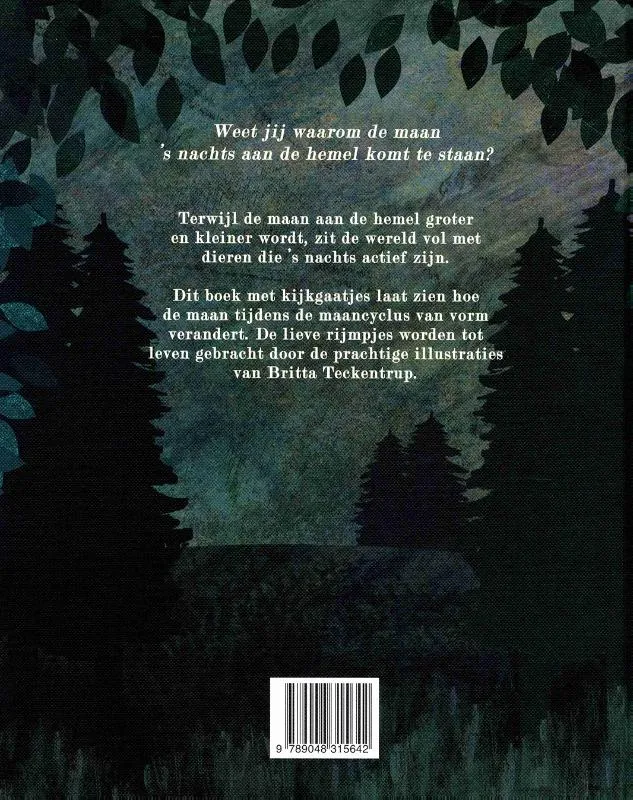 Dit boek met kijkgaatjes laat zien hoe de maan tijdens de maancyclus van vorm verandert. De lieve rijmpjes worden tot leven gebracht door de prachtige illustraties van Britta Teckentrup.