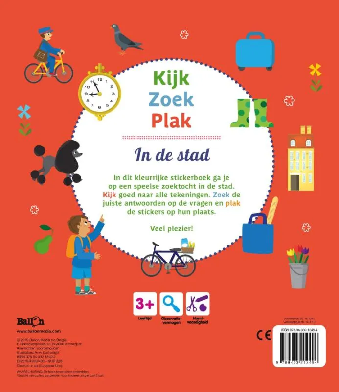 In dit kleurrijke stickerboek ga je op een speelse zoektocht in de stad. Kijk goed naar alle tekeningen. Zoek de juiste antwoorden op de vragen en plak de stickers op hun plaats. Op elke rechterpagina staat een kleurrijke scène waarin enkele stickers geplakt moeten worden om te vervolledigen. Op de linkerpagina staan enkele zoekvraagjes waardoor het tijdens het stickeren ook speuren is naar de juiste antwoorden. Leuk én leerrijk!